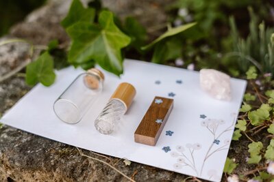 Je kunt gebruik maken van een parfum roller, een houten usb stick en een glazen flesje om bijvoorbeeld een haarlok of sieraad in te bewaren.